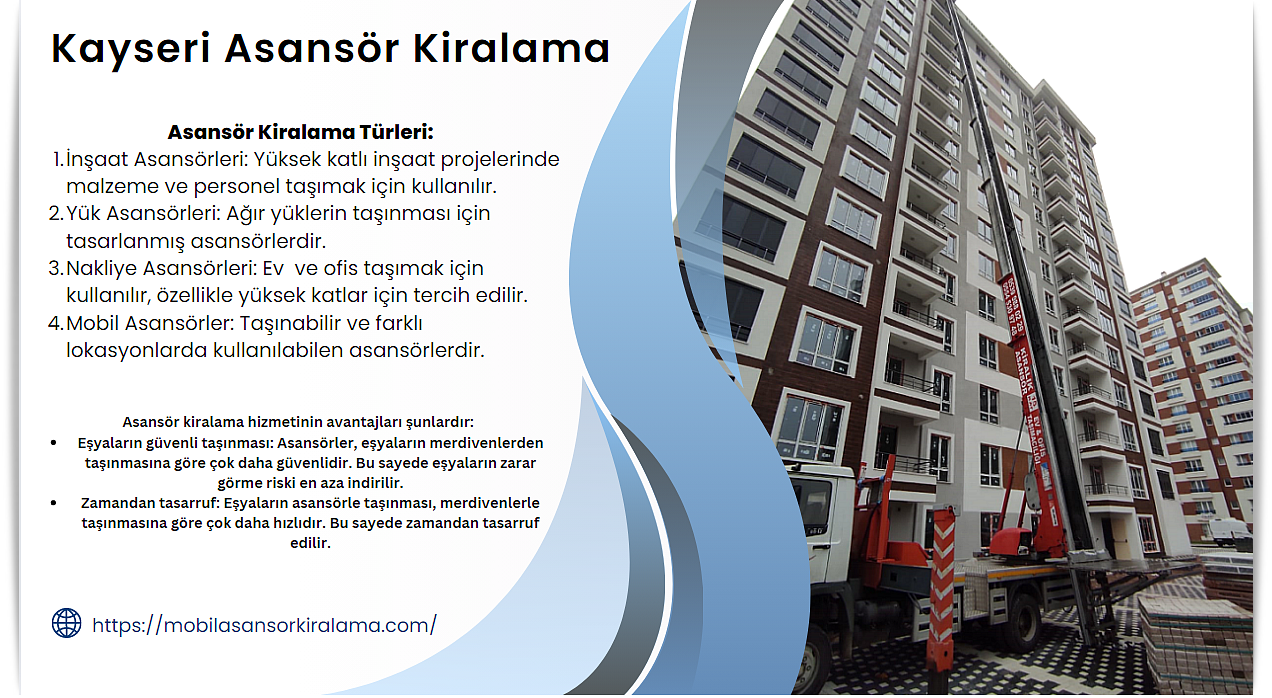 Kayseri gibi yüksek katlı yapıların yoğun olduğu şehirlerde mobil asansör kiralama hizmeti''',,, zaman kaybını önler ve eşyaların zarar görmesini engeller.